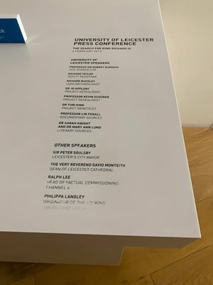 A. This is not Philippa’s recollection of her treatment by the University at the time, nor is it her experience of dealing with it now. At the time, she wrote repeatedly to the University about their erroneous claims to have led the search. They continually ignored her or dismissed her. The only press conference which actually mattered took place on 4 February 2013 to announce the results of the DNA analysis which was attended by the world’s media. She was not invited by the University to sit on the panel that faced the world’s journalists (she was seated in the audience). The University wrongly presented itself as leading the search. It is true they invited Philippa to address the conference but as the 13th of 13 speakers, long after the live TV news feed had ended. See images right showing the order of speakers who addressed the press conference on 4 February 2013, and its panel.
