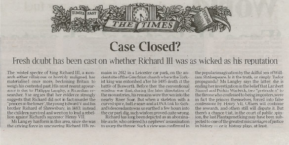 The release of the new updated edition of The Princes in the Tower, newly subtitled: How History's Greatest Cold Case Was Solved (please see below) received a stunning review from The Times newspaper today which included an 'era-defining' statement piece on its Leader page. The Times stated that 'the last Plantagenet king may have been subjected to one of the greatest miscarriages of justice in history'. Philippa Langley, originator and lead member of The Missing Princes Project international research initiative, called the review 'a significant step forward in the history of research into the life and times of Richard III'. Paying tribute to her team of over three hundred researchers from around the world, Langley added that there was so much more to come with some of the project's key researchers considering publication of their own books as they unravel key lines of investigation. The team also joined Amanda Geary, Chair of the Richard III Society, in thanking The Times for its balanced approach (see The Times letters page: Monday 26 May 2025).